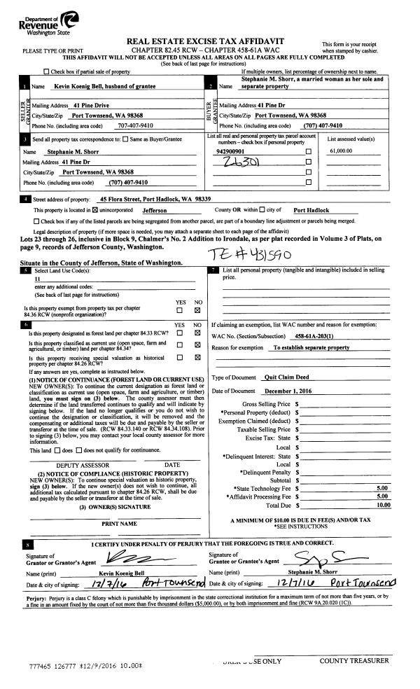 | Mailing Address: | 77 RHODY CT CHIMACUM, WA 98325-8723 | % Ownership: | 100.0000000000% |