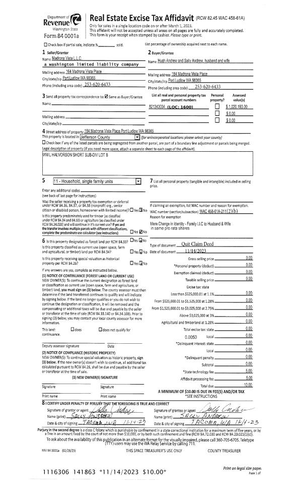 | Mailing Address: | 43 SADDLETREE DR PORT TOWNSEND, WA 98368-9537 | % Ownership: | 100.0000000000% |