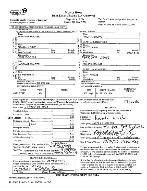 | Mailing Address: | ROBERT G & PATRICIA R HARE TRUSTEES 403 BAYCLIFF DR PORT TOWNSEND, WA 98368-9513 | % Ownership: | 100.0000000000% |