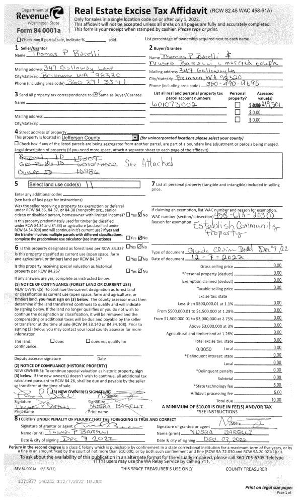 | 1 | 04/05/2023 | QCD | Quit Claim Deed | H THOMAS GILLESPIE | JACKIE E FULBRIGHT | | | $1,500.00 | 140724 | |