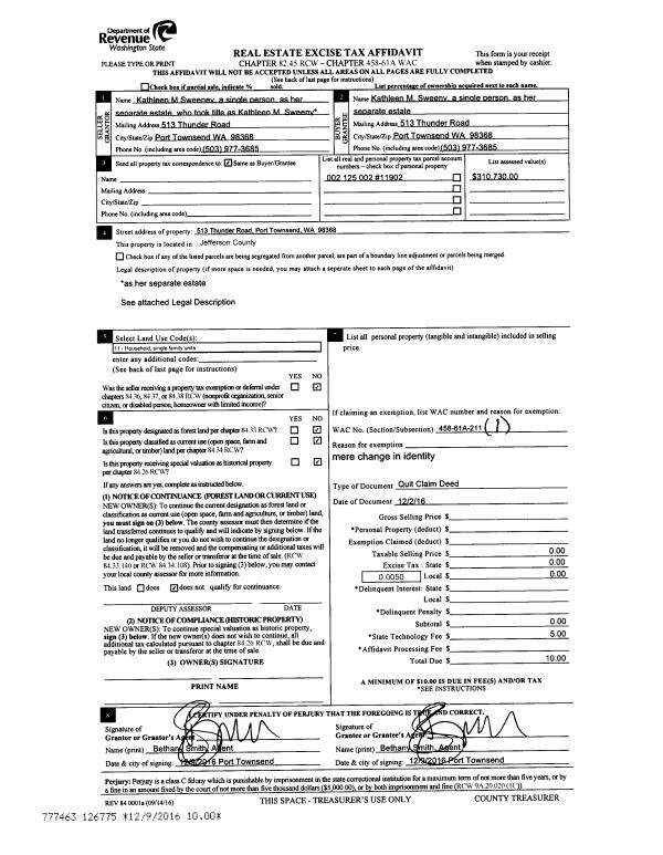 | Mailing Address: | TRISHA WALTON ROBERT & JODI EASLEY 1341 COUNTRY LN BELLINGHAM, WA 98225-8513 | % Ownership: | 100.0000000000% |
