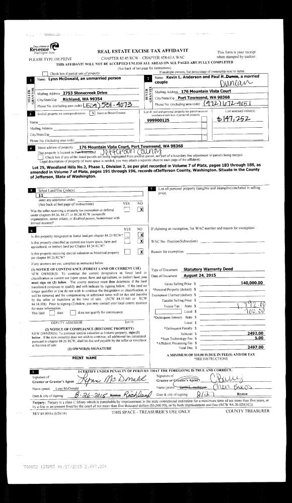 | 1 | 03/16/2016 | SWD | Statutory Warranty Deed | DONAN R ALDINE TRUSTEE | MARK E & KIM M DOYLE | | | $2,500.00 | 125068 | |