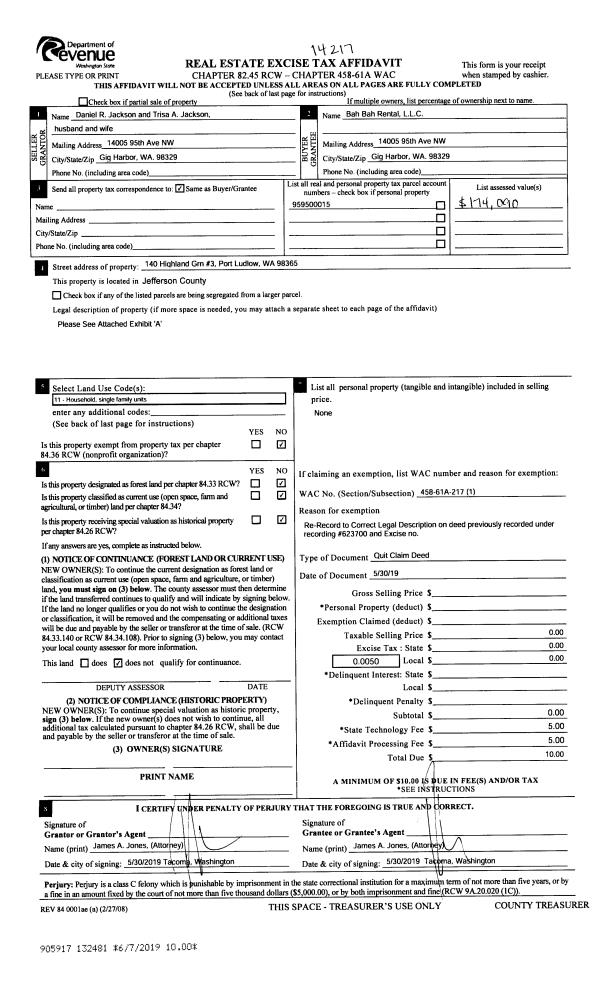 | Mailing Address: | 70 BLUFFS DR UNIT 2 PORT TOWNSEND, WA 98368 | % Ownership: | 100.0000000000% |