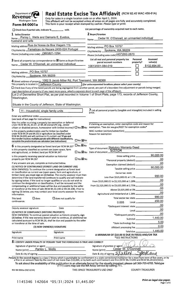 | Mailing Address: | 826 VAN BUREN ST PORT TOWNSEND, WA 98368-8053 | % Ownership: | 100.0000000000% |