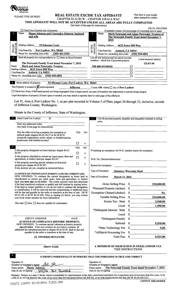 | 3 | 05/04/2017 | SWD | Statutory Warranty Deed | TACHE O BENTLEY | ANDREW & THERESA COCHRANE | | | $425,000.00 | 127639 | |