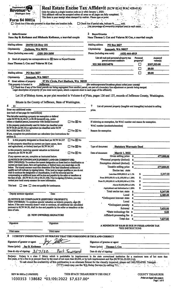 | 2 | 10/10/2022 | SWD | Statutory Warranty Deed | THERETT & SUSANNE LEWIS TRUST | ROBERT W & ROBIN SCOTT | | | $525,000.00 | 139951 | |