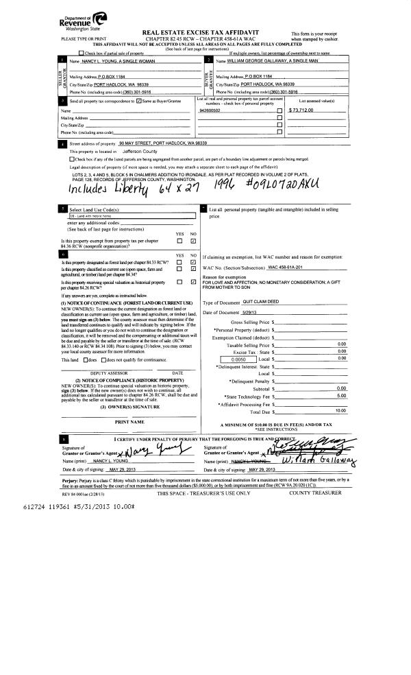 | Mailing Address: | 46 VILLAGE WAY PMB 186 PORT LUDLOW, WA 98365 | % Ownership: | 100.0000000000% |