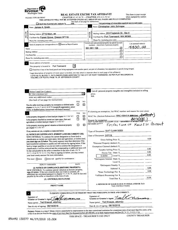 | 7 | 06/22/1995 | REC | Real Estate Contract | POPE RESOURCES | THORSEN, WILLIAM A/BARBARA F | 0 | 0 | $143,000.00 | 77215 | 0 |
