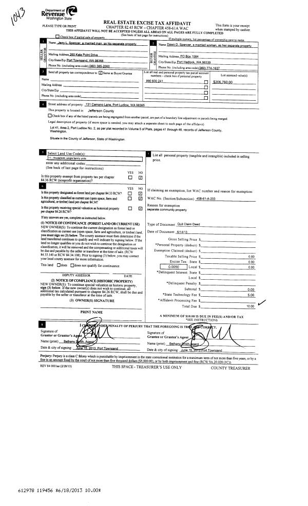 | 3 | 10/12/2005 | QCD | Quit Claim Deed | JUDSON, BURTON/FAYE L | JUDSON, BF/FL TRTS | 0 | 0 | $0.00 | 105026 | 0 |
