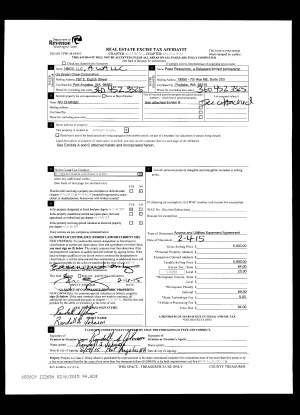 | 5 | 06/24/1994 | REC | Real Estate Contract | POPE RESOURCES | CRANE CREEK LAND COMPANY | 0 | 0 | $37,050.00 | 74496 | 0 |