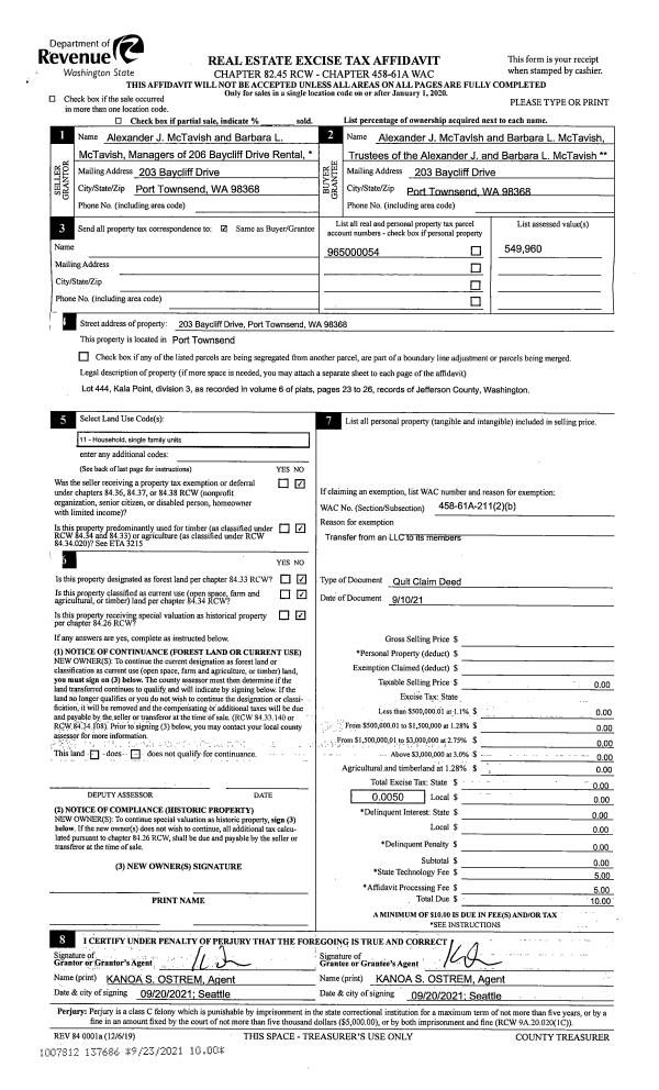 | Mailing Address: | 40 MADRONA VISTA PL PORT LUDLOW, WA 98365-9504 | % Ownership: | 100.0000000000% |