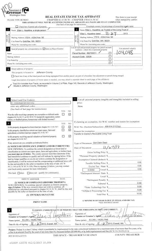 | 3 | 08/06/2013 | DILF | Deed in Lieu of Foreclosure | EDWARD E STINSON | U S BANK NA | | | | 120022 | |