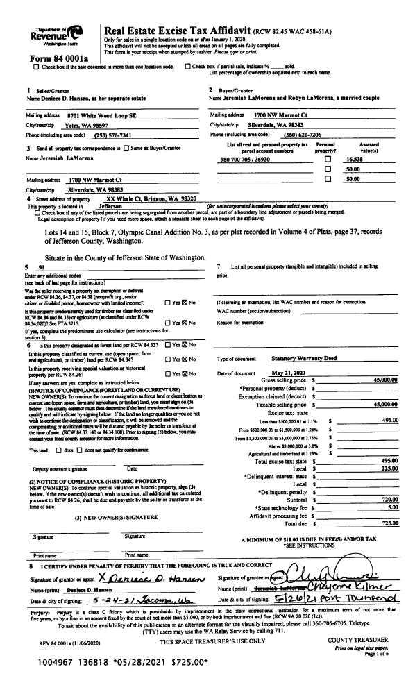 | 1 | 08/13/2021 | SWD | Statutory Warranty Deed | LINDA J ADELMANN MARITAL TRUST | THOMAS C & NIKKI SKIPPER | | | $765,000.00 | 137410 | |