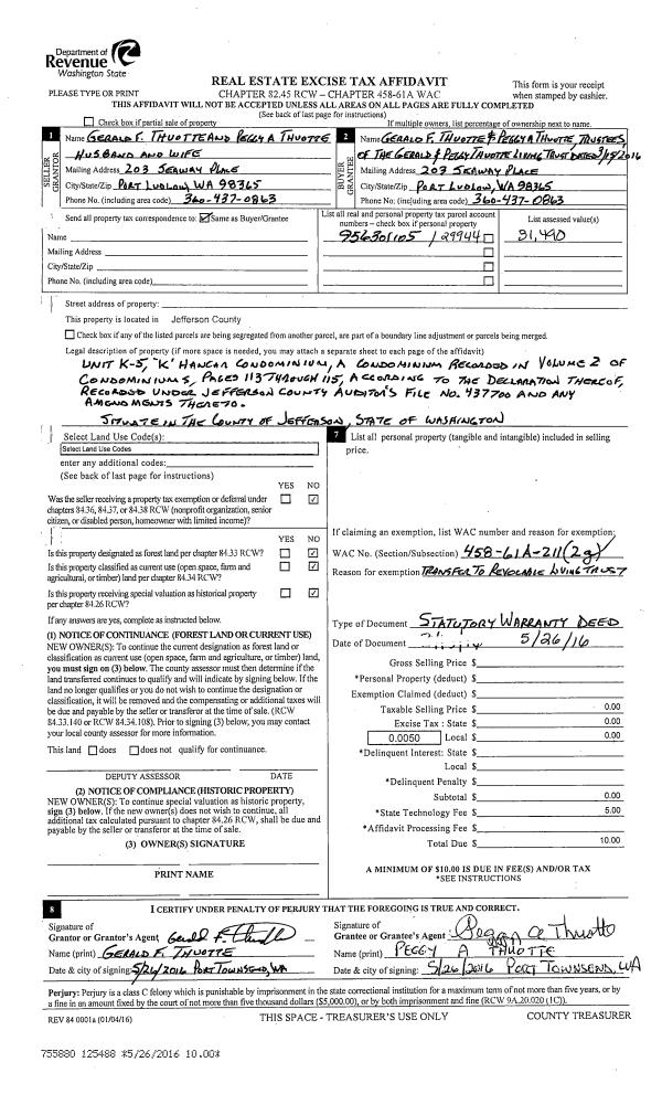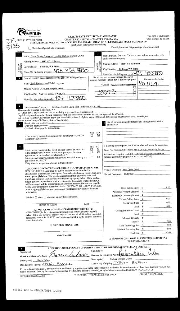 | Mailing Address: | JAMES H & LYNNE E DEWITT TRUSTEES 1240 W SIMS WAY #14 PORT TOWNSEND, WA 98368 | % Ownership: | 100.0000000000% |