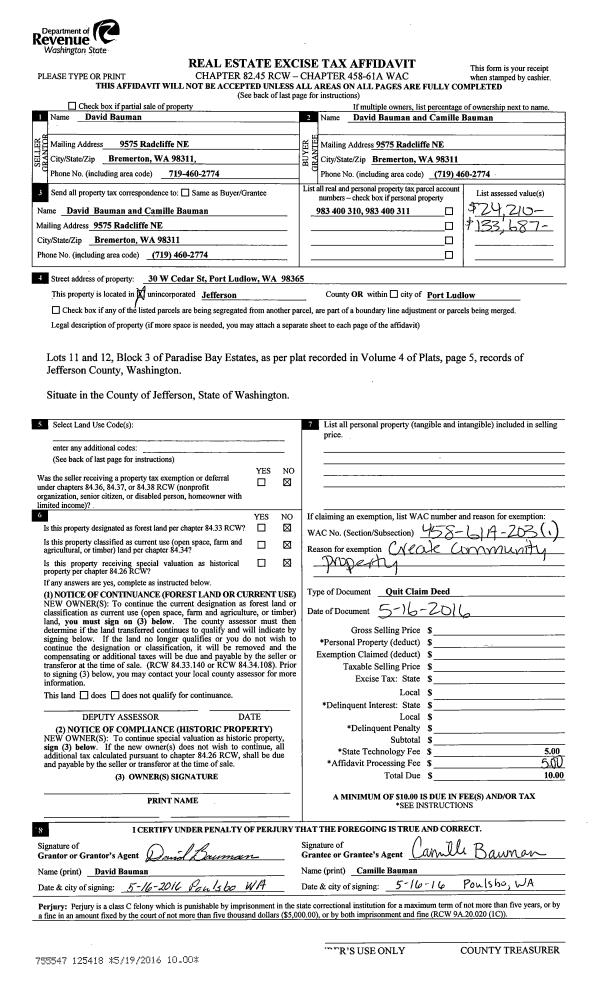 | 2 | 09/28/2016 | QCD | Quit Claim Deed | WILLIAM L & ELIZABETH A THOMPSON | THOMPSON FAMILY TRUST | | | | 126677 | |