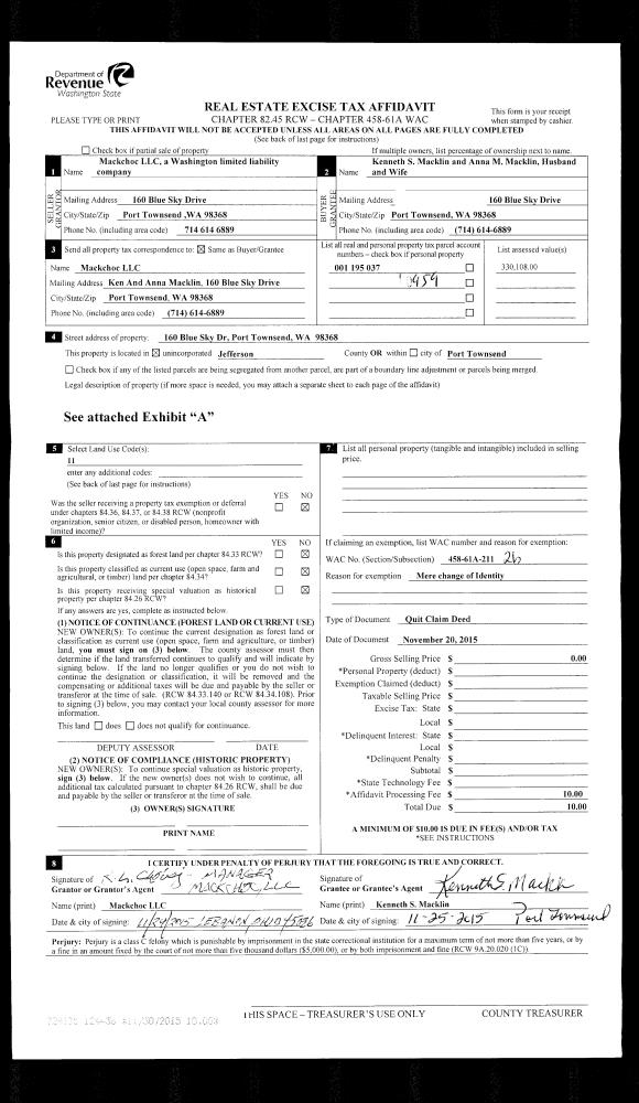 | Mailing Address: | WILLIAM THOMPSON TRUSTEE ELIZABETH THOMPSON TRUSTEE 253 MYRTLE RD PORT TOWNSEND, WA 98368 | % Ownership: | 100.0000000000% |
