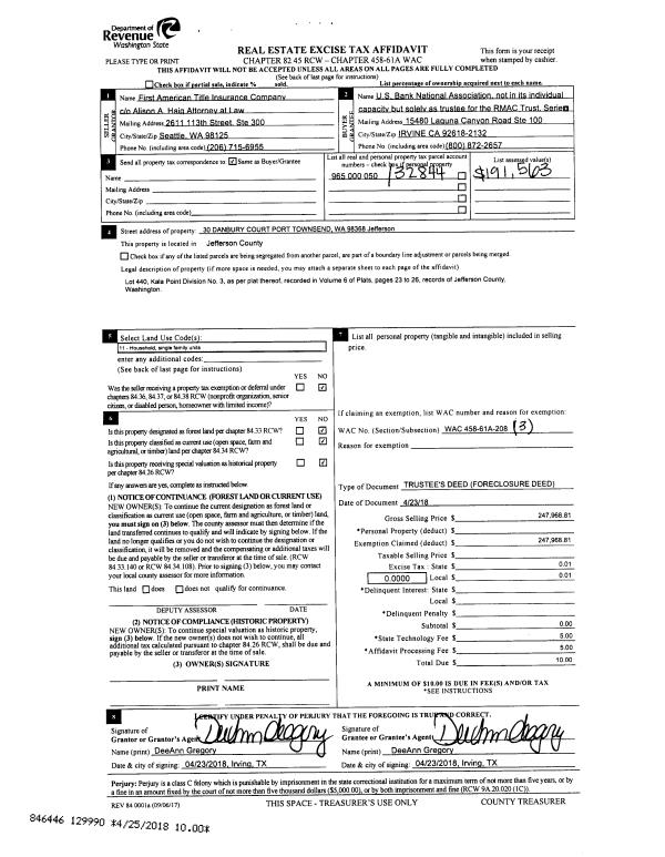 | 1 | 05/06/2024 | SWD | Statutory Warranty Deed | JAMES T GRAFSGAARD SPECIAL NEEDS TRUST | HUNTER FITCH | | | $22,000.00 | 142786 | |