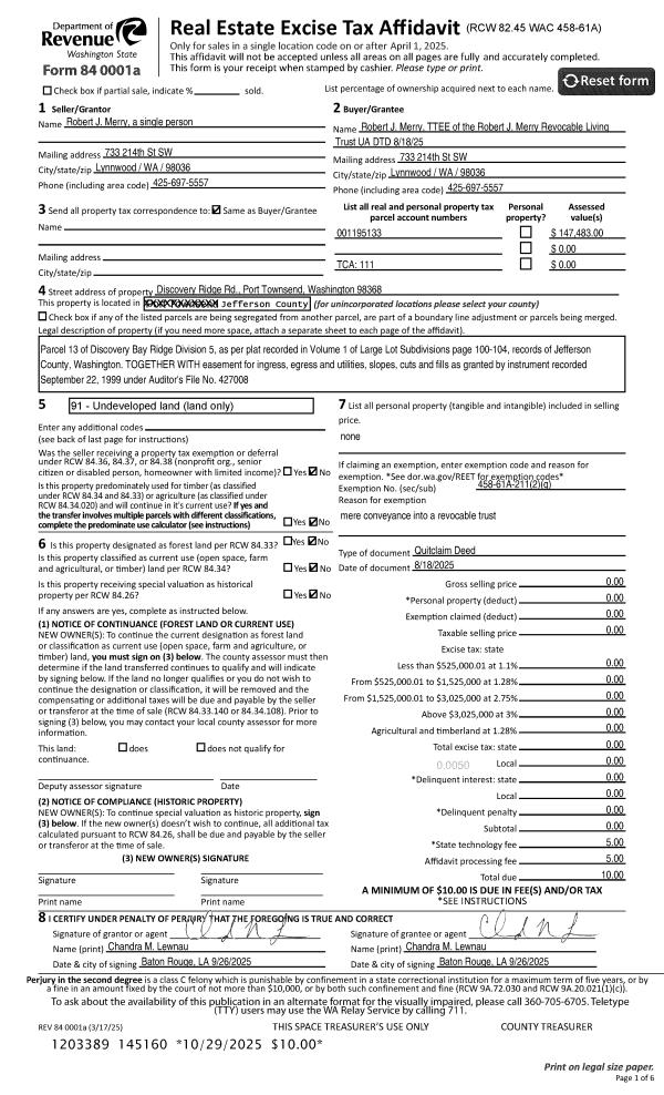 | Mailing Address: | 148 STUB RD ONALASKA, WA 98570 | % Ownership: | 100.0000000000% |