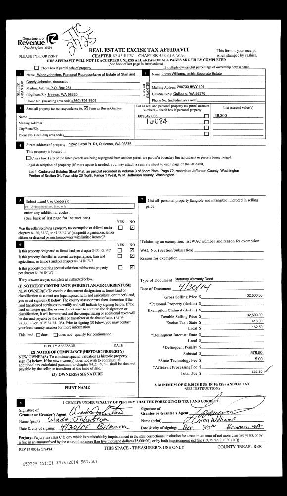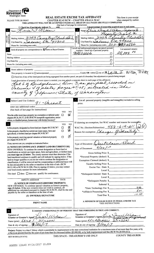 | Mailing Address: | 6062 STATE ROUTE 20 UNIT 56 PORT TOWNSEND, WA 98368-9301 | % Ownership: | 100.0000000000% |