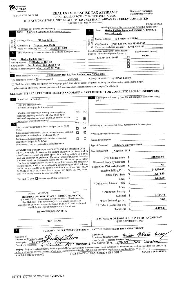 | 1 | 05/29/2019 | SWD | Statutory Warranty Deed | PORT LUDLOW ASSOCIATES LLC | MARK L & HILARY M OLSON | | | $469,900.00 | 132475 | |