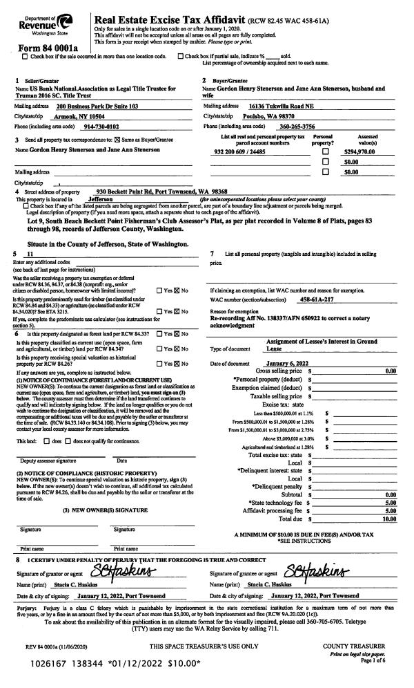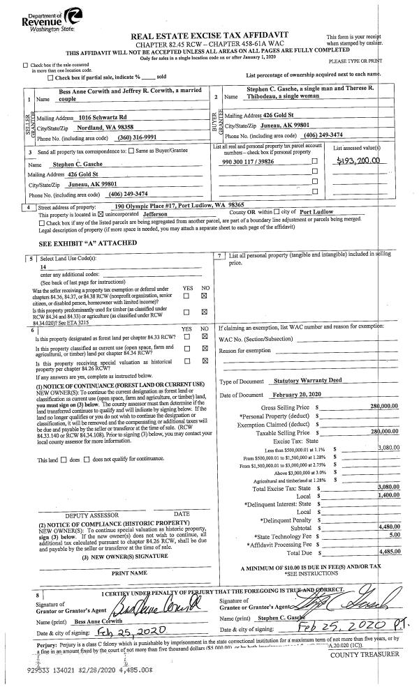 | 1 | 07/07/2022 | SWD | Statutory Warranty Deed | PORT LUDLOW ASSOCIATES LLC | MICHAEL D & MARGUERITE M WYER | | | $481,400.00 | 139450 | |