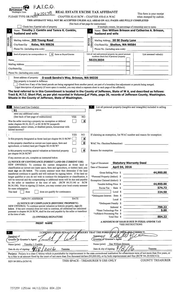 | 3 | 08/04/2016 | SWD | Statutory Warranty Deed | STEVEN W BROOKS | THOMAS G TUNGSVIK | | | $13,000.00 | 126079 | |