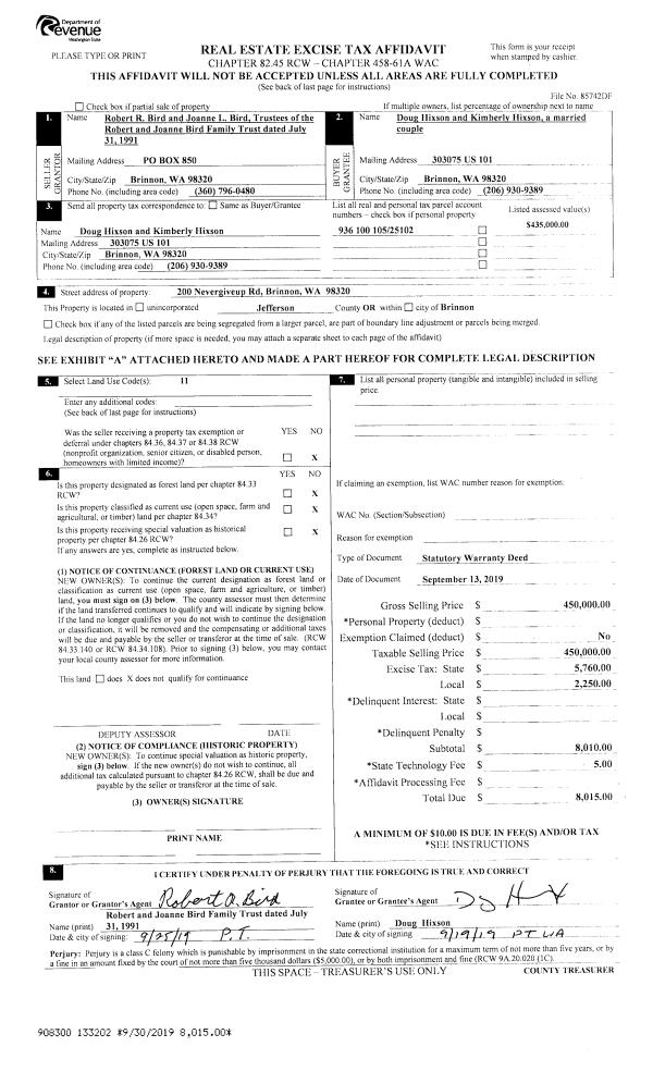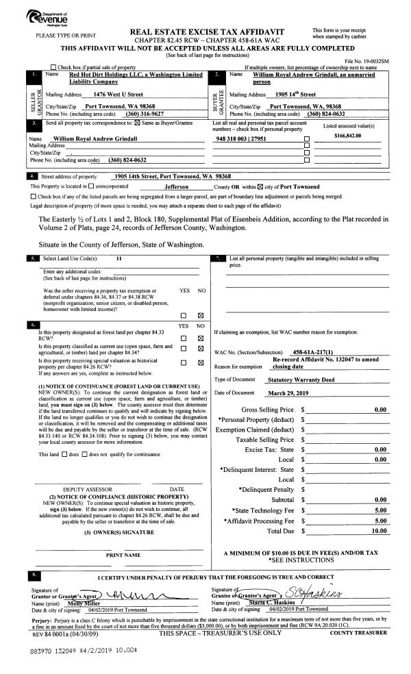 | 1 | 10/16/2019 | SWD | Statutory Warranty Deed | TINA HAMMOND | MICHAEL LECCISI & BERNICE HSU | | | $27,500.00 | 133357 | |