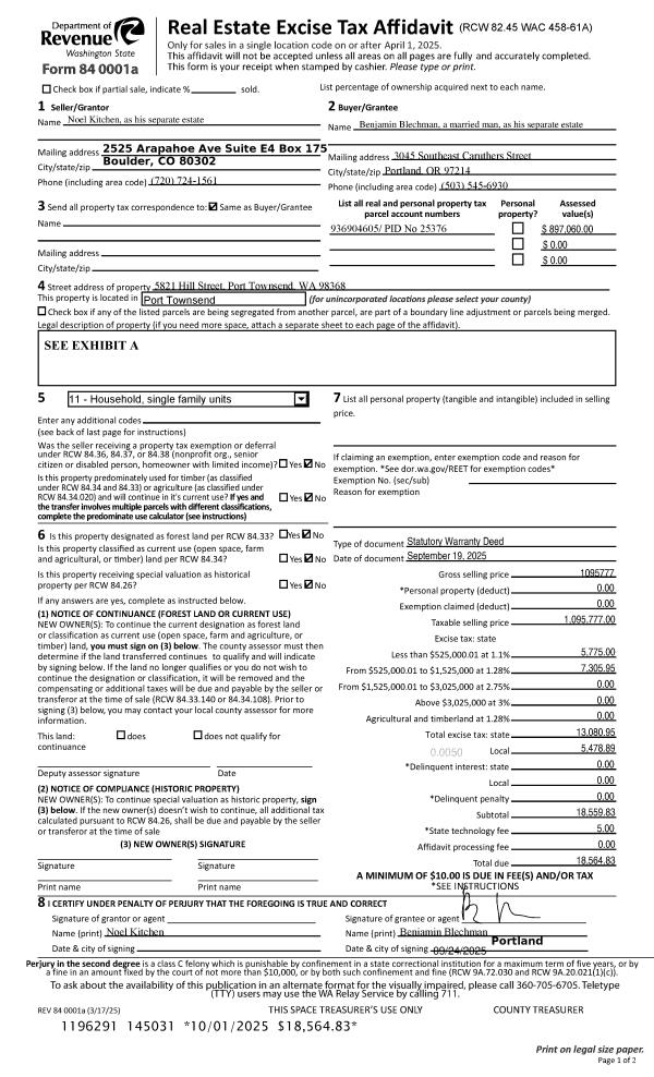 | Mailing Address: | VIOLET D DEPUTY 261 BLUEJAY LN PORT LUDLOW, WA 98365-9570 | % Ownership: | 100.0000000000% |