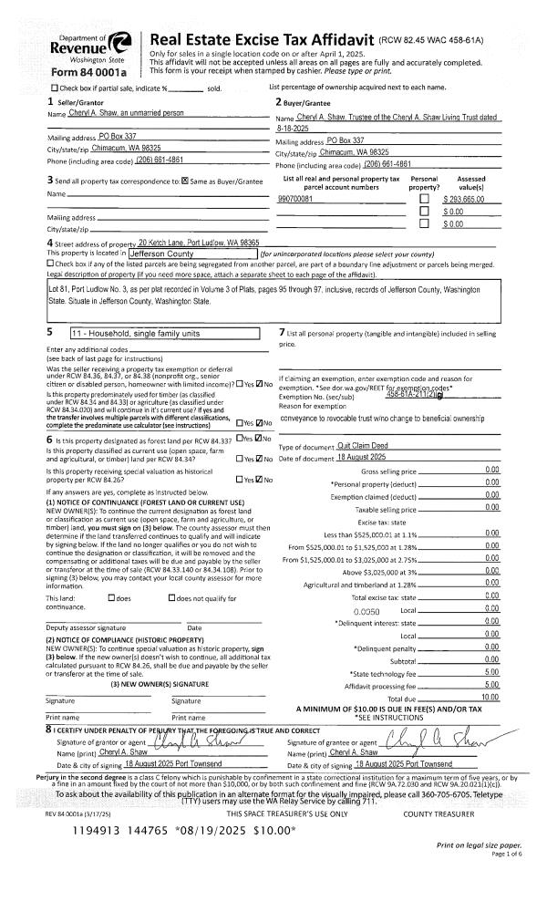 | Mailing Address: | PO BOX 65366 PORT LUDLOW, WA 98365-0366 | % Ownership: | 100.0000000000% |