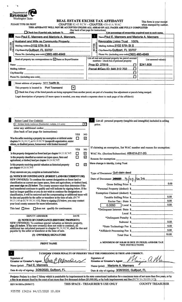| Mailing Address: | 1413 ROSE ST PORT TOWNSEND, WA 98368-4027 | % Ownership: | 100.0000000000% |