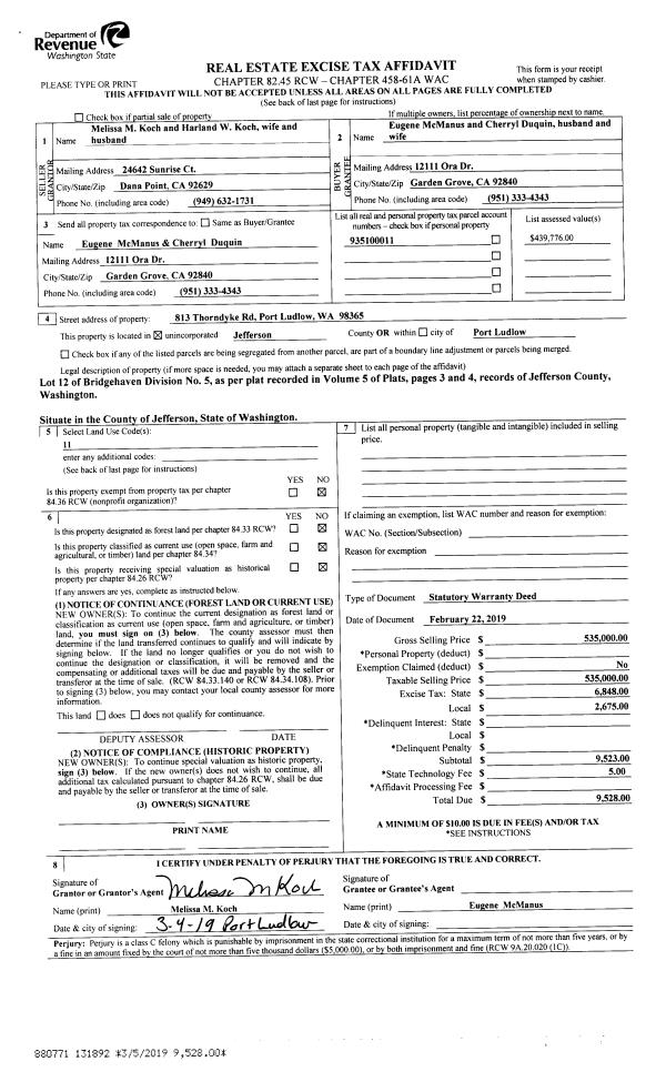 | 6 | 06/19/1997 | SWD | Statutory Warranty Deed | HAMILTON HEIGHTS LLC | CITY OF PORT TOWNSEND | 0 | 0 | $0.00 | 82198 | 0 |
