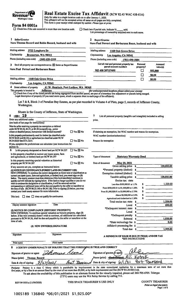 | 2 | 08/09/2021 | SWD | Statutory Warranty Deed | LOUISE C MARLEY | MARK V FINCO & KAREN R SPECTOR | | | $1,075,000.00 | 137445 | |