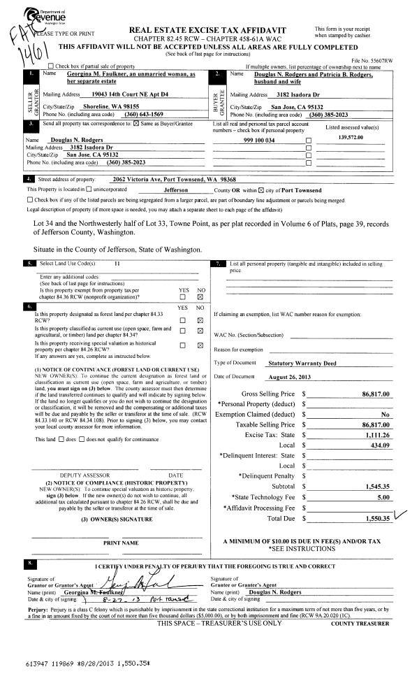 | Mailing Address: | DEBORAH K FULTZ 62 PORT HADLOCK HEIGHTS PL PORT HADLOCK, WA 98339 | % Ownership: | 100.0000000000% |