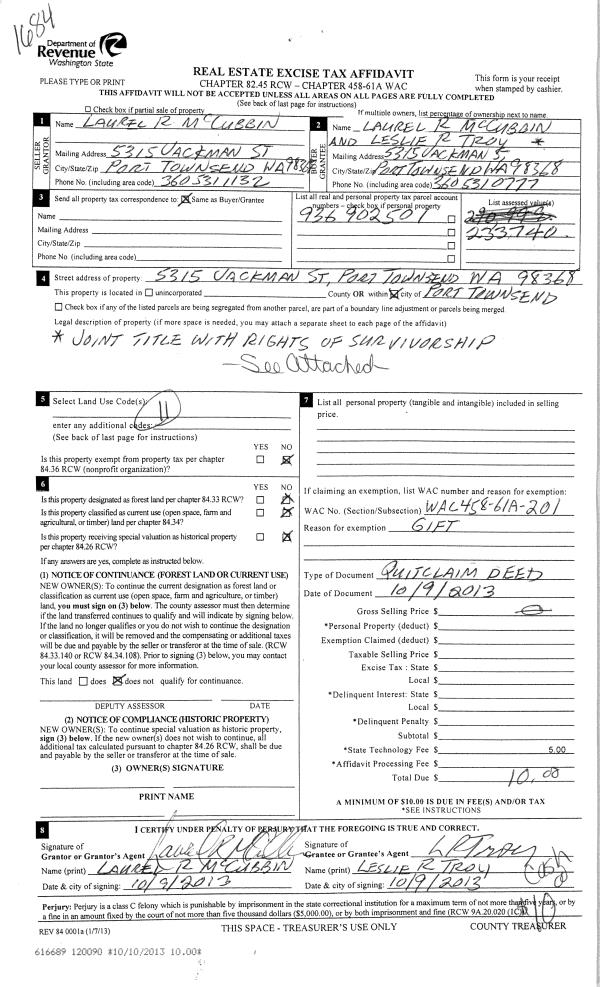 | Property ID: | 39285 | Abbreviated Legal Description: | PORT TOWNSEND O.T. BLK 7 LOT 5(E 1/2), 6(E29'1) INCL TL DIST 34 & 35 |