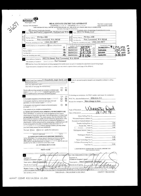 | 1 | 01/22/2018 | EASE | Assignment of Easement | LIFE DESIGN HOMES LLC | CITY OF PORT TOWNSEND | | | $1,836.00 | 129461 | |