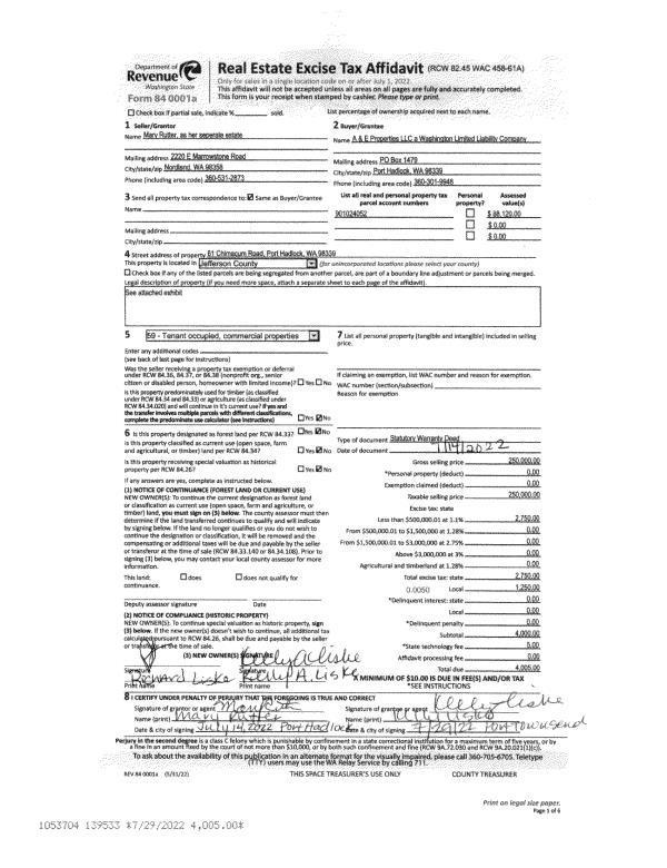 | 8 | 04/15/2002 | SWD | Statutory Warranty Deed | PORT TOWNSEND HOTEL INVES | GAIR, JOHN J/POST, PAULA A | 0 | 0 | $1,450,000.00 | 94431 | 0 |