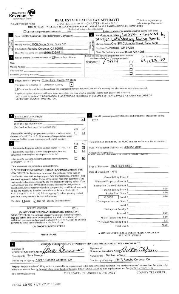 | 1 | 11/01/2017 | TRED | Trustee Deed | | | | | | 129027 | |