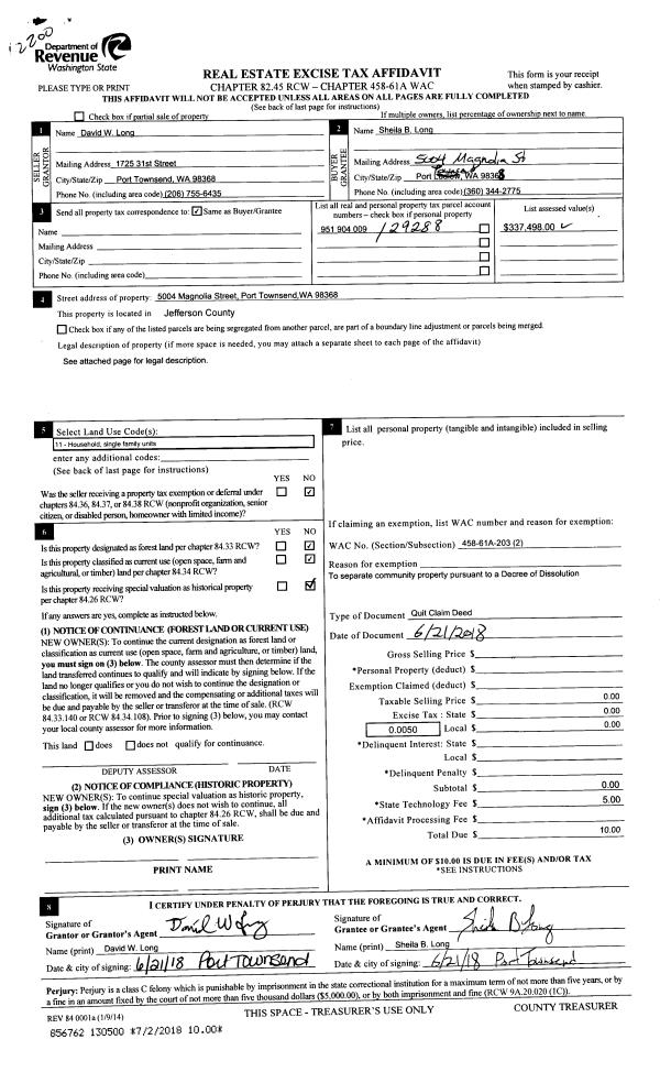 | 7 | 01/15/2001 | SWD | Statutory Warranty Deed | JOHNSON, THOMAS B/ELAINE | DENMERRA, INC., A WA CORP | 0 | 0 | $575,000.00 | 91525 | 0 |