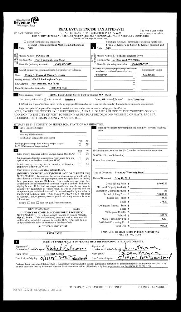 | Property ID: | 39503 | Abbreviated Legal Description: | PORT TOWNSEND O.T. BLK 100 LOTS 1 THRU 5(ALL) LOT 6(LESS TAX 41) N1/2 VAC FRANKLIN ST SUBJ/EASE |