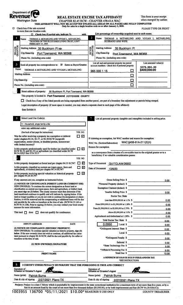 | Mailing Address: | 1508 CLAY ST PORT TOWNSEND, WA 98368-8118 | % Ownership: | 100.0000000000% |