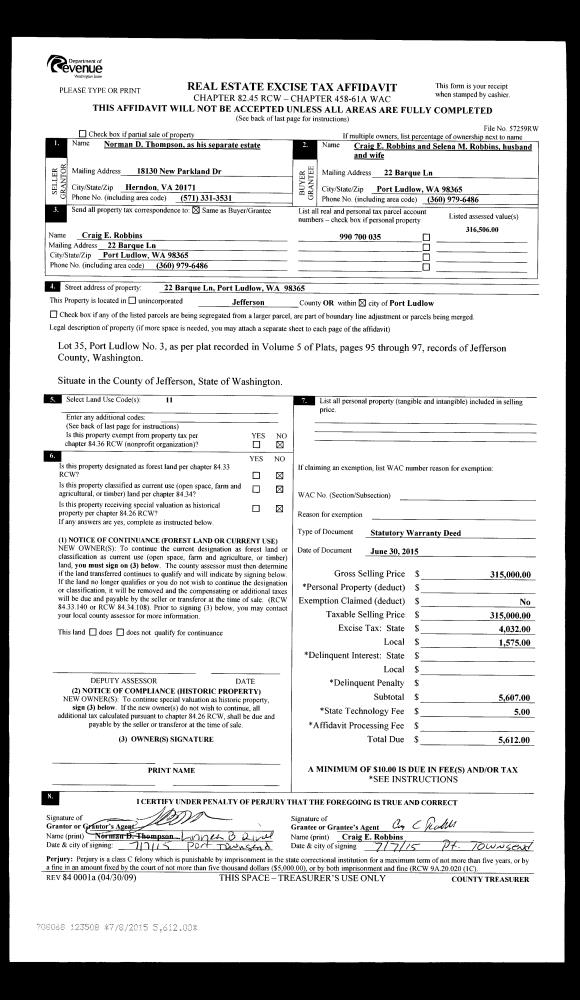 | Property ID: | 39744 | Abbreviated Legal Description: | PORT LUDLOW NO 7 LOT 13 SUBJ TO ESMTS OF RECORD |