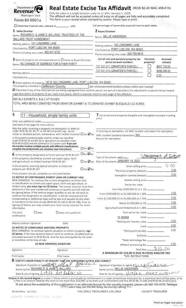 | Mailing Address: | 41 N BAY LN UNIT 2 PORT LUDLOW, WA 98365-9307 | % Ownership: | 100.0000000000% |