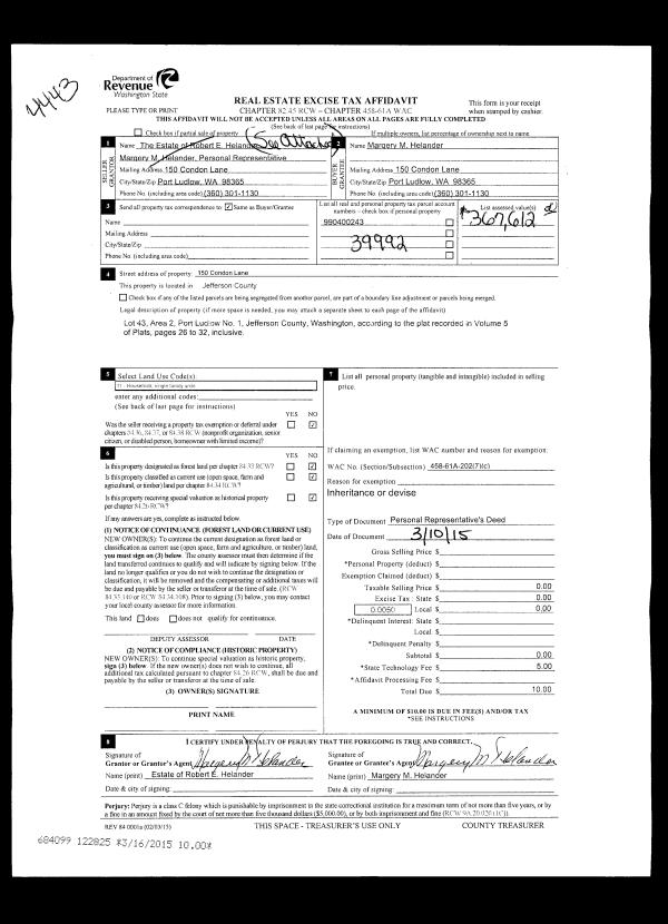 | 4 | 02/21/1996 | SWD | Statutory Warranty Deed | 1031 EXCHANGE COORDINATOR | APT #901 PORT LUDLOW CONDO #2 | 0 | 0 | $0.00 | 79352 | 0 |