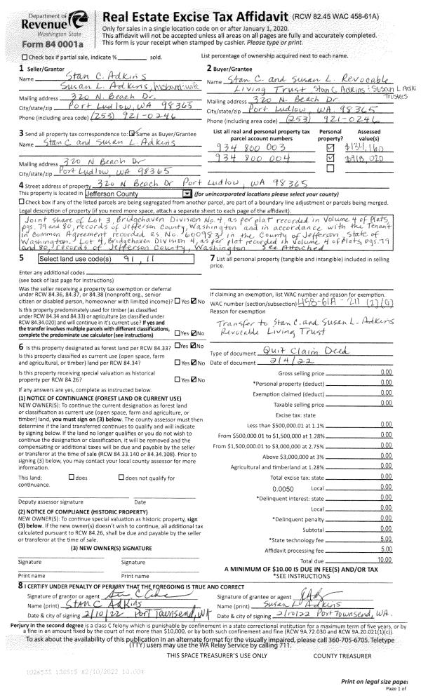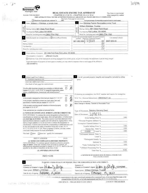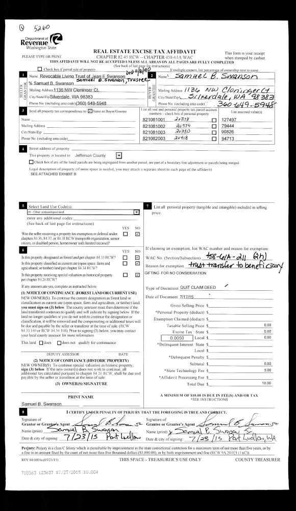 | Mailing Address: | DIANE GARRISON TRUSTEE ELMER D COLE TRUSTEE 30 ADMIRALTY LN UNIT 316 PORT LUDLOW, WA 98365-8260 | % Ownership: | 100.0000000000% |
