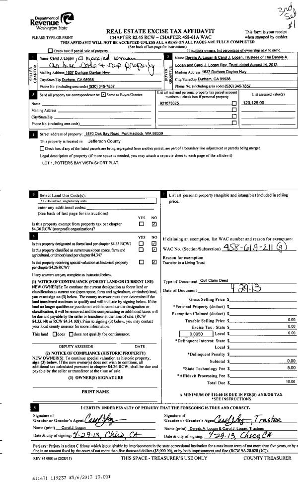 | 3 | 11/12/2013 | SWD | Statutory Warranty Deed | DALE W WITT | JOHN G JOHNSON LIVING TRUST | | | $319,000.00 | 120290 | |