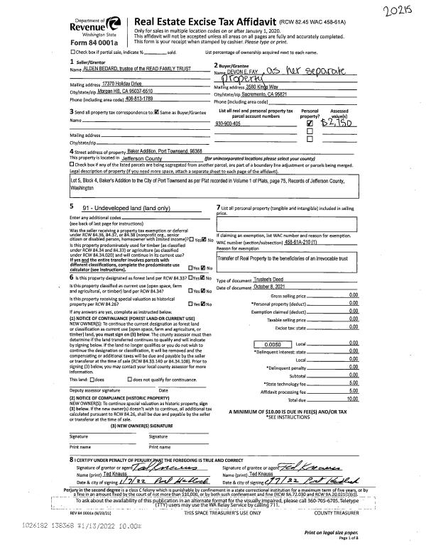 | 1 | 10/26/2020 | SWD | Statutory Warranty Deed | RONALD H BELL TRUSTEE | LEE & SHARRISA PARANADA | | | $93,500.00 | 135482 | |