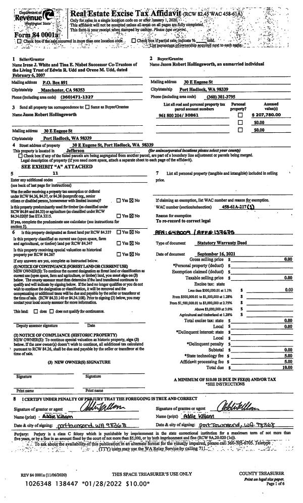 | Mailing Address: | BARBARA A SWORD 2023 E SIMS WAY #362 PORT TOWNSEND, WA 98368 | % Ownership: | 100.0000000000% |