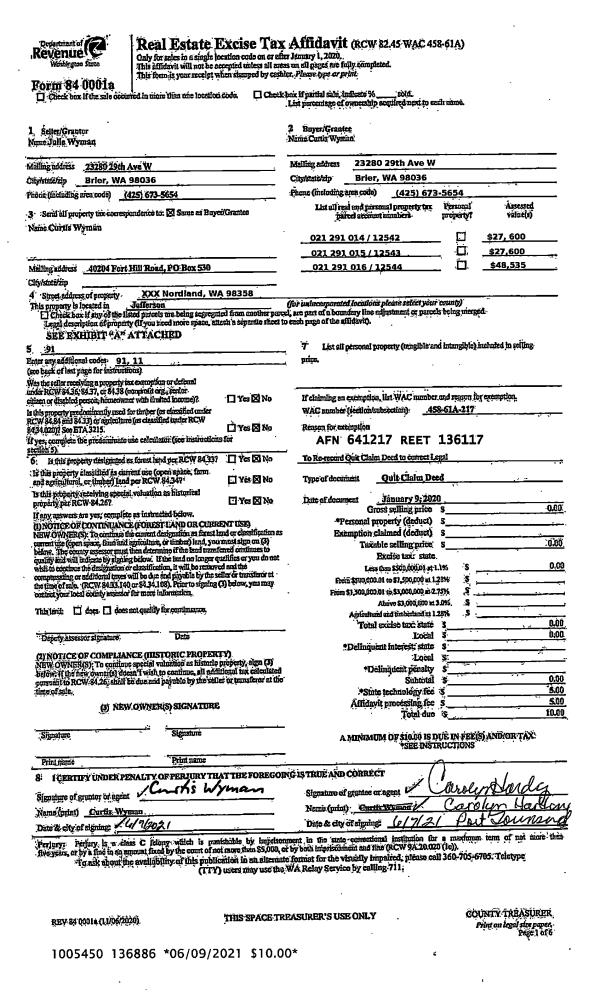 | 1 | 09/20/2021 | QCD | Quit Claim Deed | JAMIESON HODGSON | JAMIESON & CHELSEA HODGSON | | | | 137657 | |