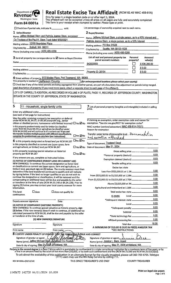 | 3 | 07/10/2024 | SWD | Statutory Warranty Deed | PORT LUDLOW ASSOCIATES LLC | KAY MOL | | | $650,000.00 | 142879 | |
