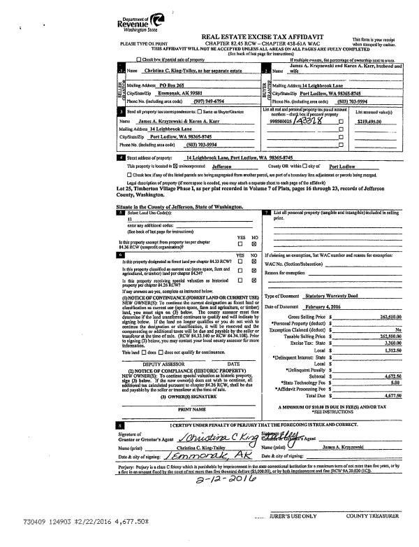 | 4 | 12/20/2016 | SWD | Statutory Warranty Deed | HELEN APIECIONEK TSTE | ALCALA 2010 LIVING TRUST | | | $48,500.00 | 126887 | |